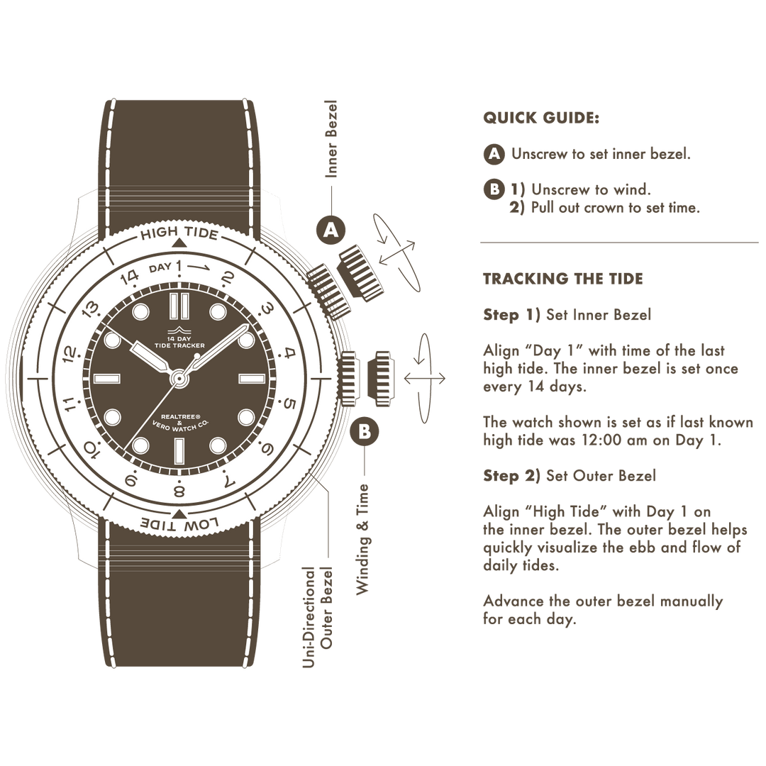 Because tidal movements follow lunar time—advancing by roughly 51 minutes with each cycle—the bezels provide an accurate and repeatable method for tracking these shifts. This makes it easy to follow tidal changes without relying on standard time.