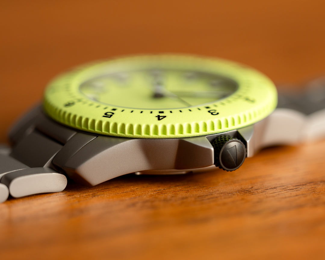 Having a durable crystal on a dive watch is crucial. In deeper waters, a sapphire crystal remains intact, unlike a mineral glass crystal that can crack or splinter under pressure. Sapphire crystals are naturally anti-reflective and boast a hardness of 9 out of 10 on the Mohs scale, with only diamonds being harder, scoring a perfect 10.