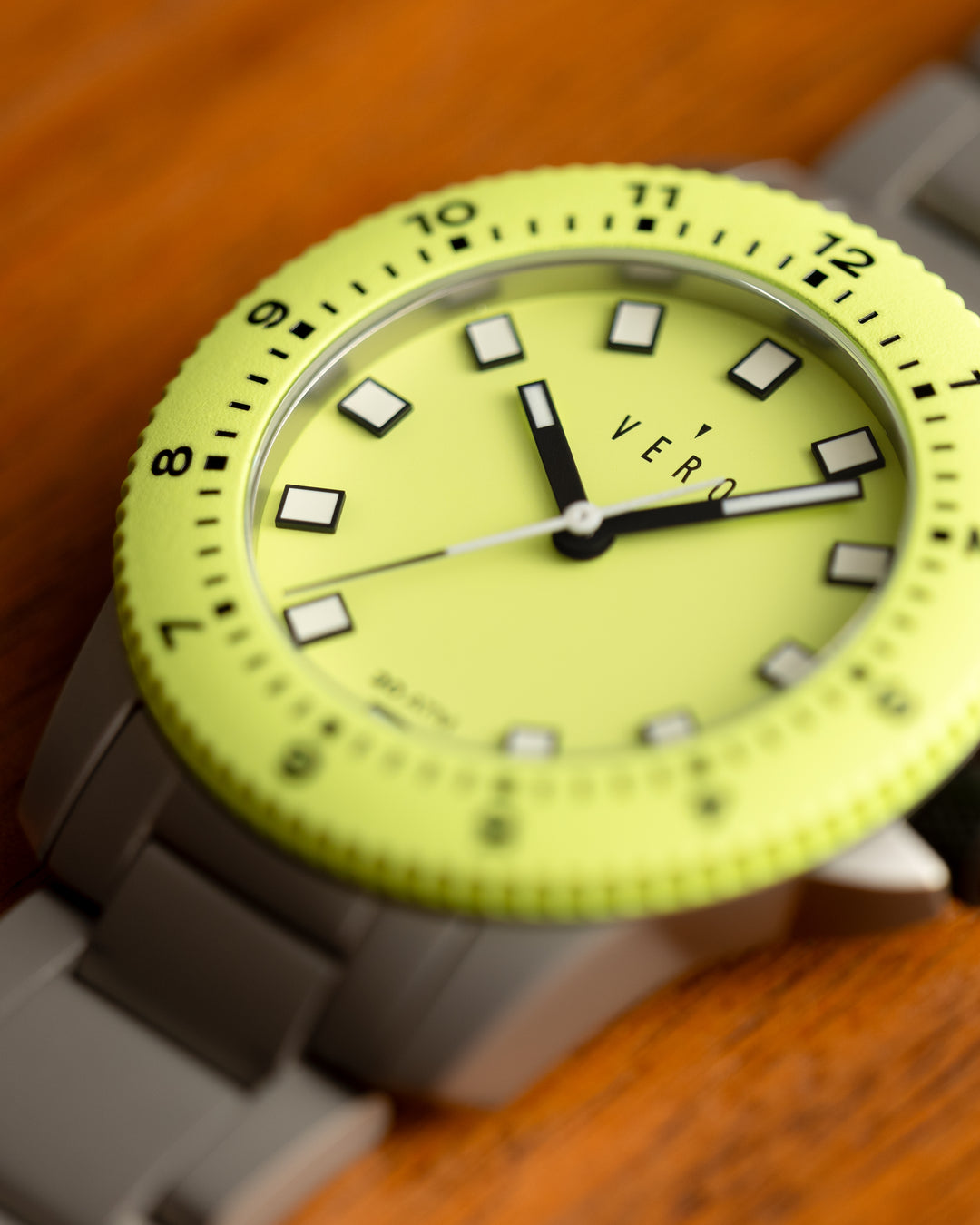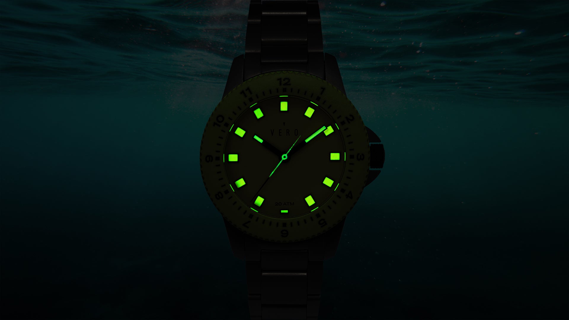 All VERO watches feature a multi-gasket stem and crown/case tube configuration. The case tube has an extended sealing face that maintains contact with the o-ring across the stroke of the setting positions, ensuring the watch remains sealed even when setting the time. The watch case includes an indentation where an o-ring, or gasket, rests. During assembly, the o-ring is coated with a thin layer of silicone grease to create an airtight seal when the case back is tightened down, sitting flush against the case.