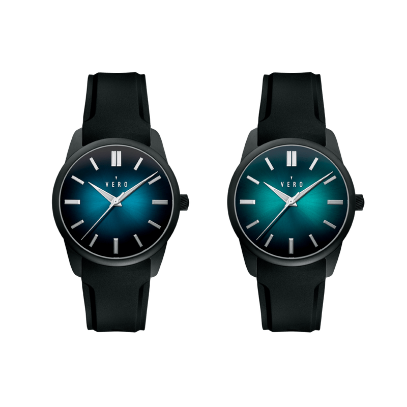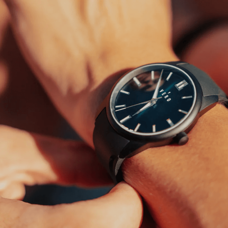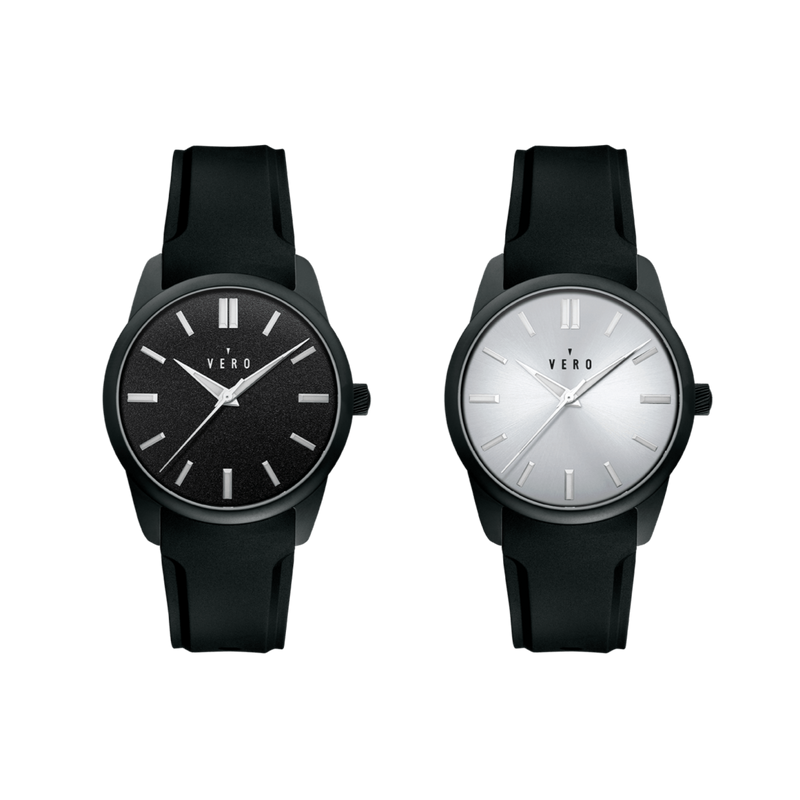 This series is our first unisex watch design. The case and lugs have a slim, contouring shape that curve over the wrist, held on with a curved black silicone band.