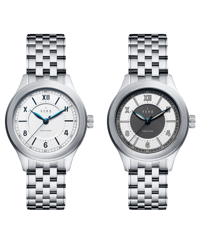 Meridian Manual Wind watches are assembled and regulated to +/- 5 seconds per day in our shop in Portland, Oregon. Each mechanical movement has black rhodium plated bridges, snail finished ratchet wheels, and iridescent blued screws.