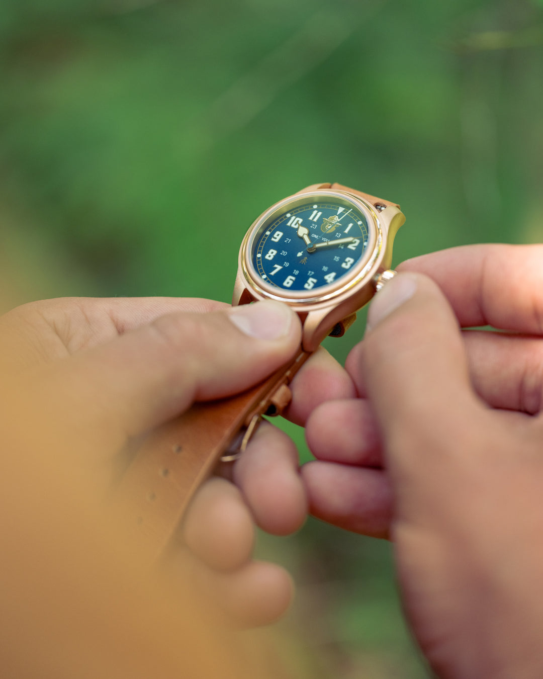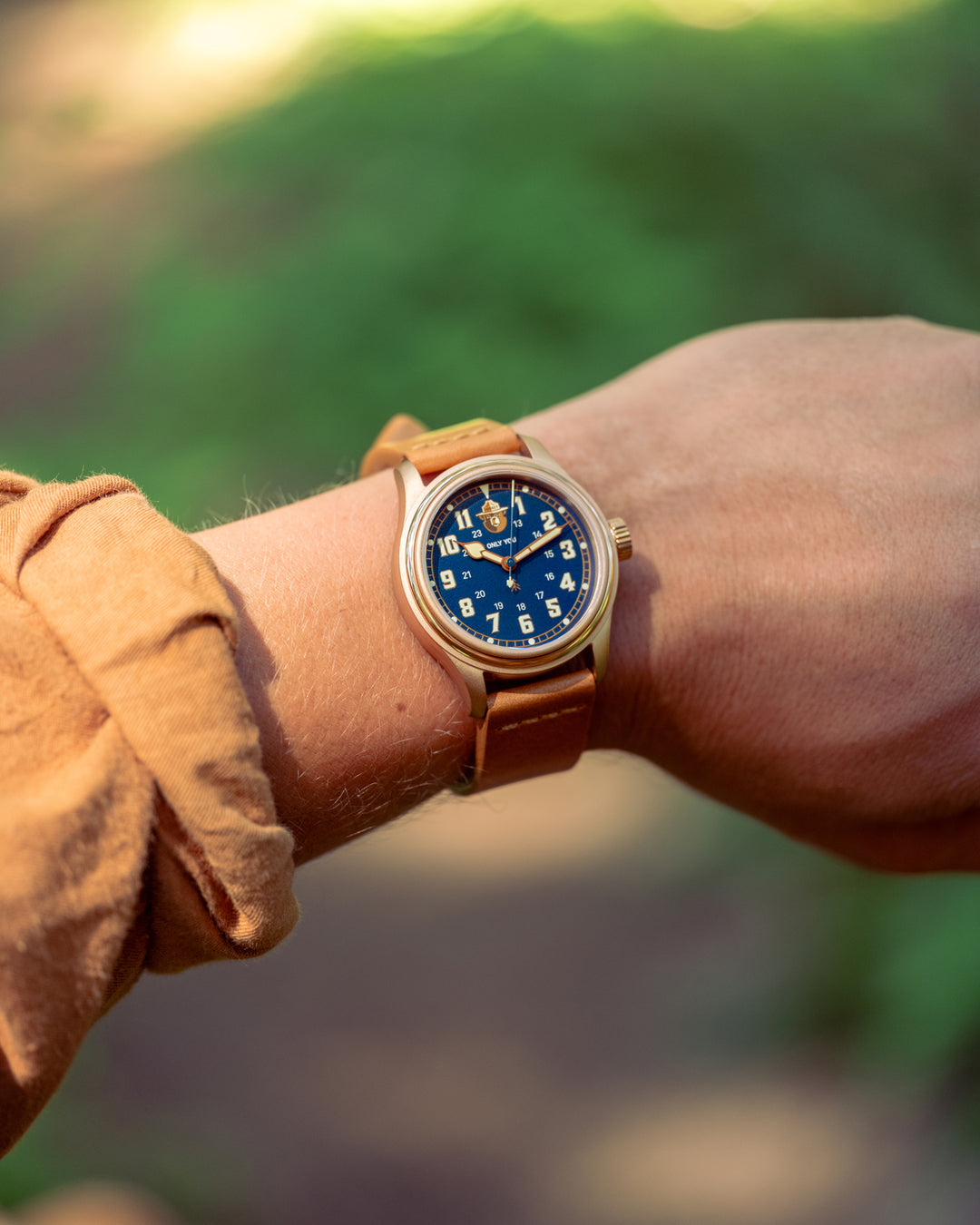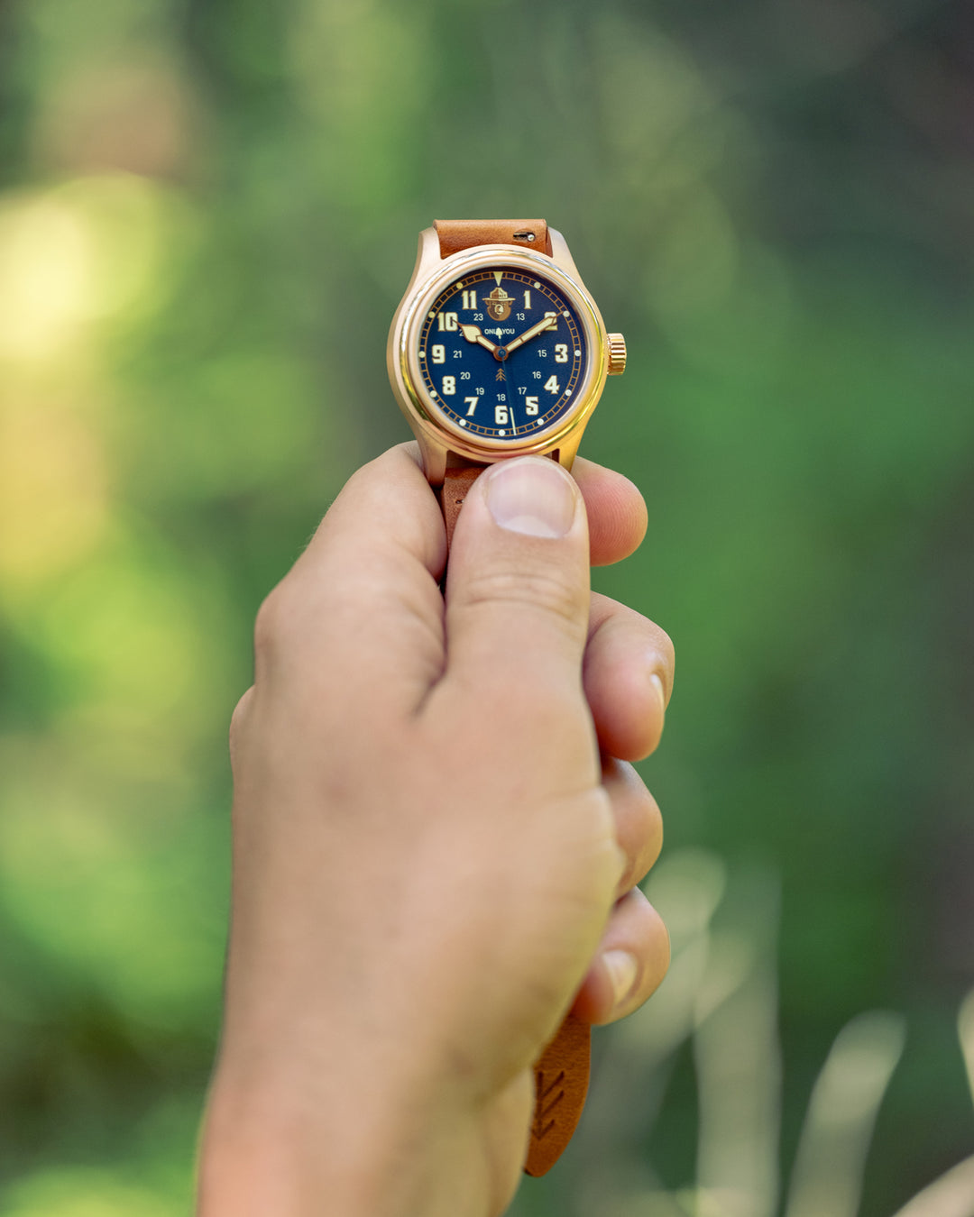 The Smokey Bear 80th Anniversary Watch features a satin finish bronze case. This material is unique due to its ability to develop a natural patina over time, giving each watch a distinctive, evolving character. This aging process not only enhances the watch's aesthetic appeal but also provides a layer of corrosion resistance.
