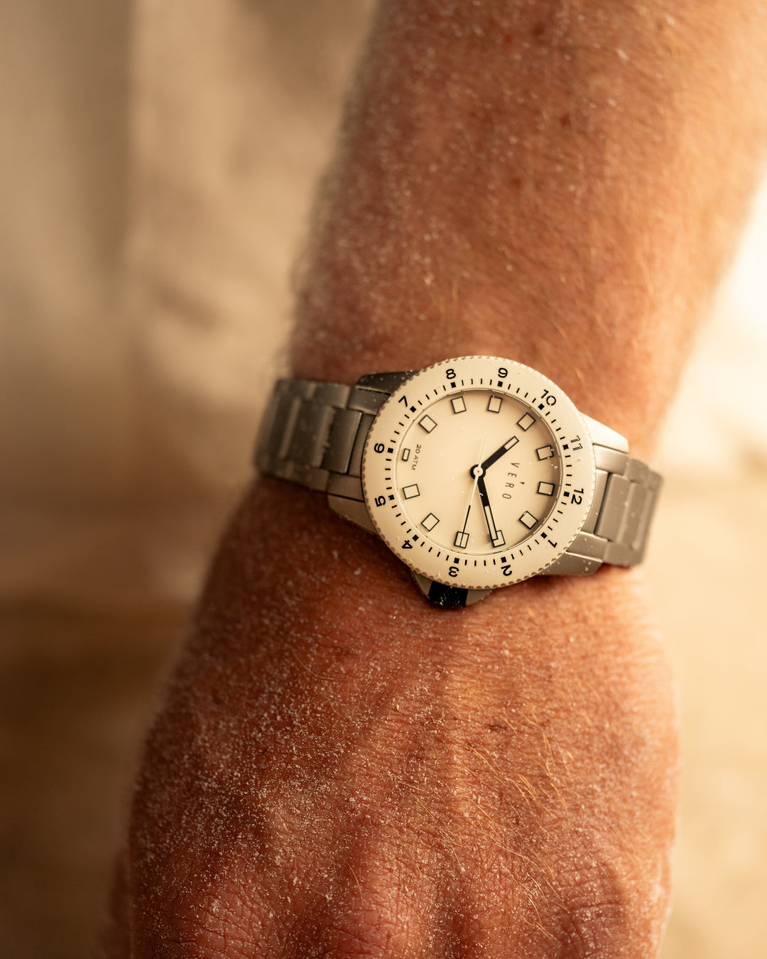 All VERO watches feature a multi-gasket stem and crown/case tube configuration. The case tube has an extended sealing face that maintains contact with the o-ring across the stroke of the setting positions, ensuring the watch remains sealed even when setting the time. The watch case includes an indentation where an o-ring, or gasket, rests. During assembly, the o-ring is coated with a thin layer of silicone grease to create an airtight seal when the case back is tightened down, sitting flush against the case.