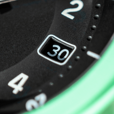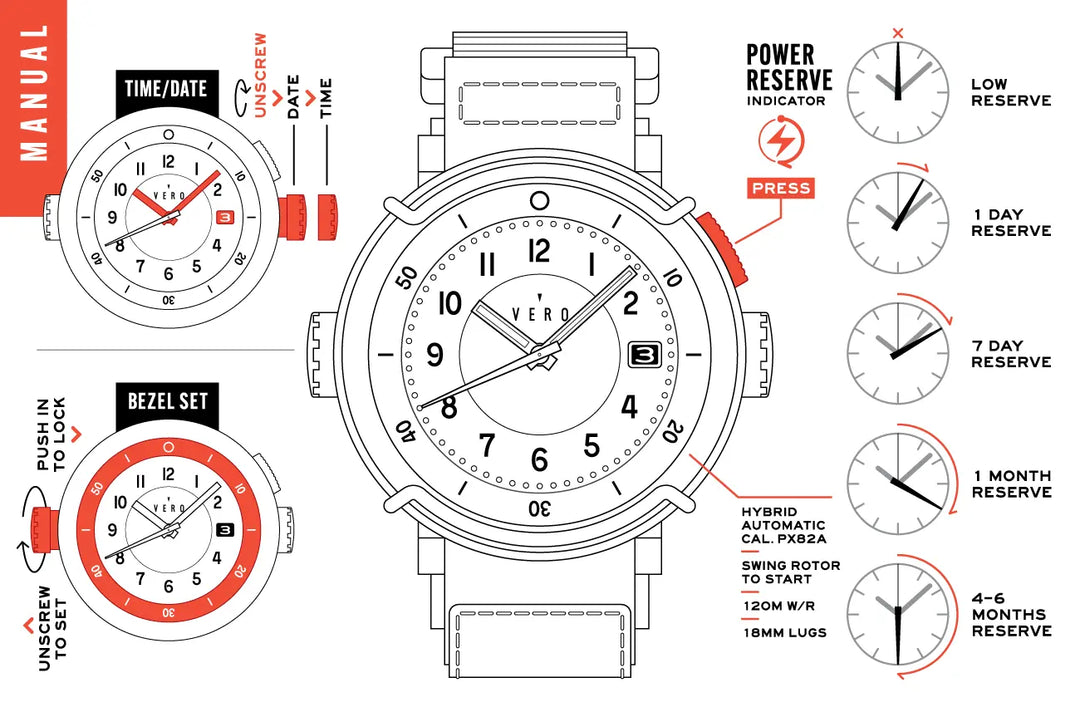 Compress the button on the case to operate the sweeping hand of the power reserve indicator. Be sure to mark your start time to get an accurate reading.