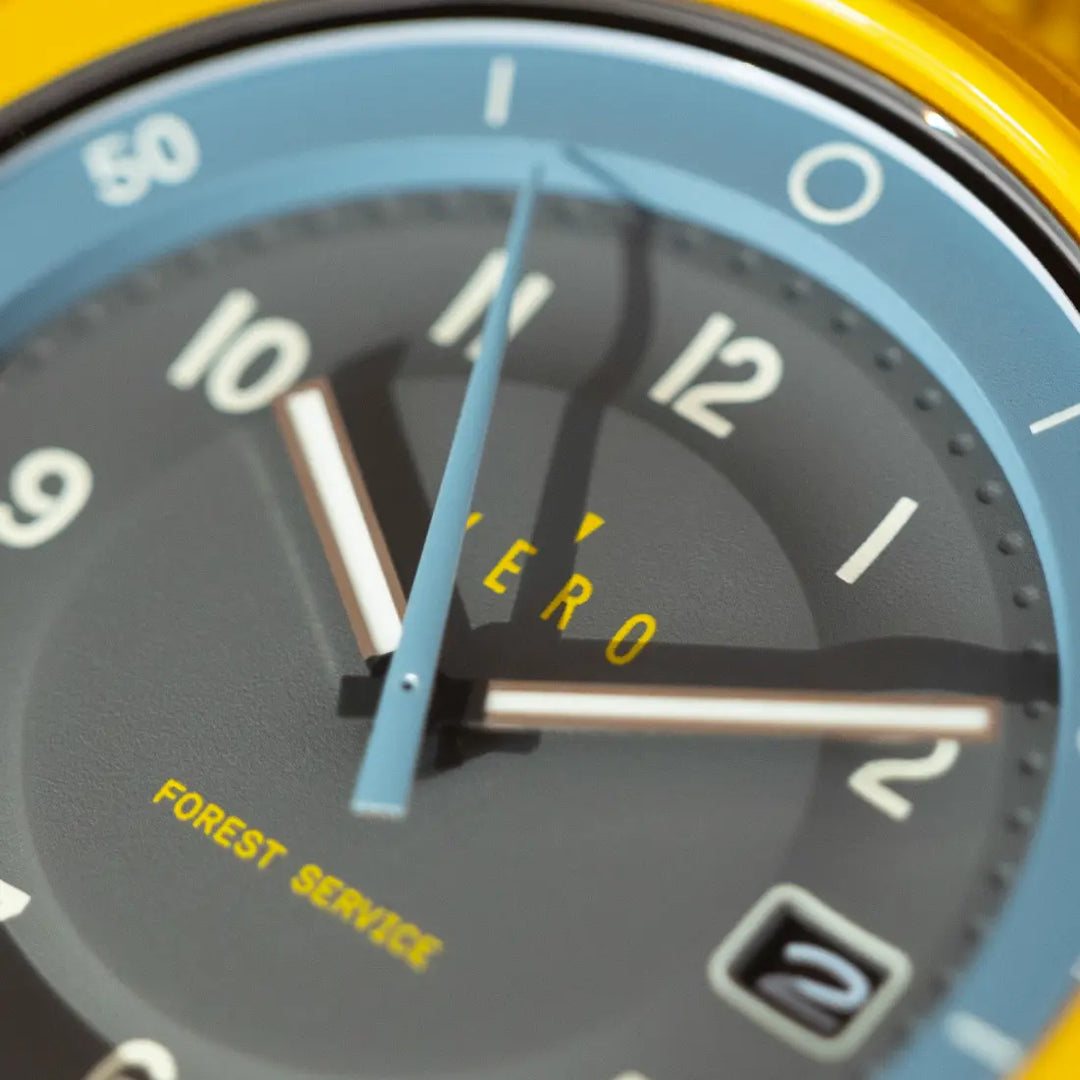 The Forest Service watches feature minimalistic hands, inner bezel markers, and numerals, all filled with Super LumiNova . They are designed for high-action, low-effort.