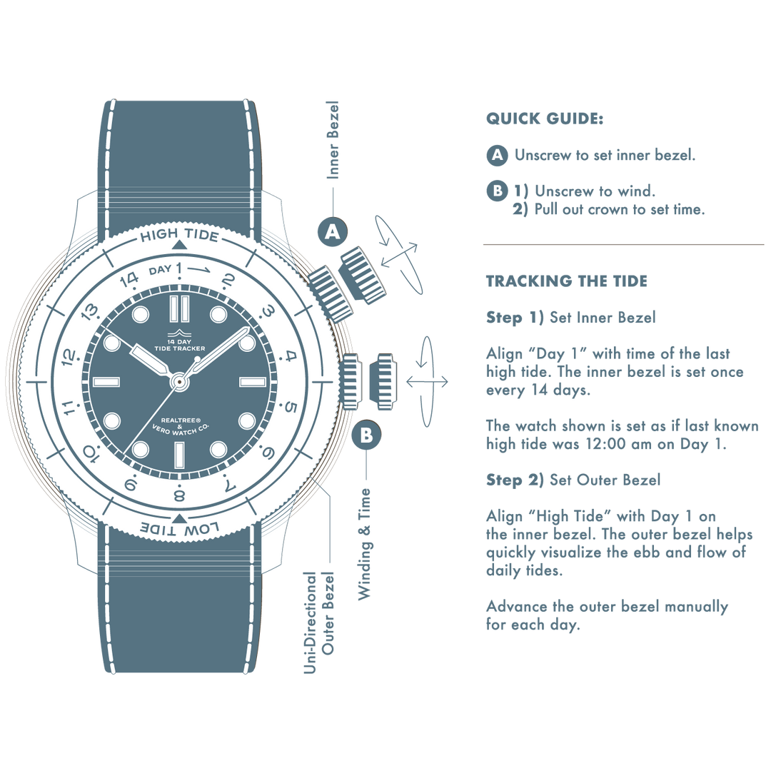 Because tidal movements follow lunar time—advancing by roughly 51 minutes with each cycle—the bezels provide an accurate and repeatable method for tracking these shifts. This makes it easy to follow tidal changes without relying on standard time.