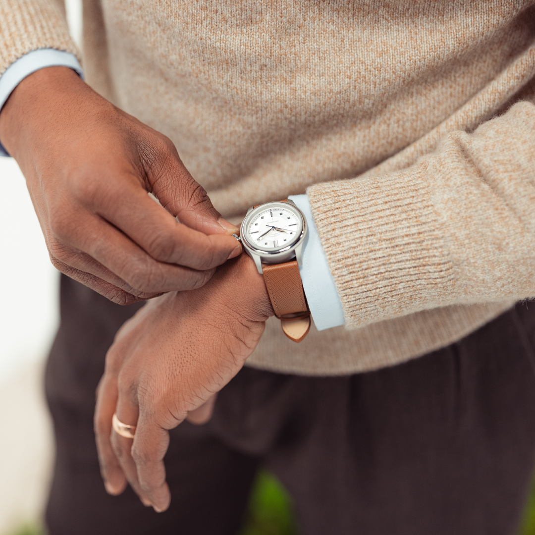 A lume-less design lets the monochromatic palette and textured sector design of the dial shine. Applied pyramid indices, leaf-style hands, and a blue seconds counter add just the right amount of distinction, together resulting in a refined, modern timekeeper.